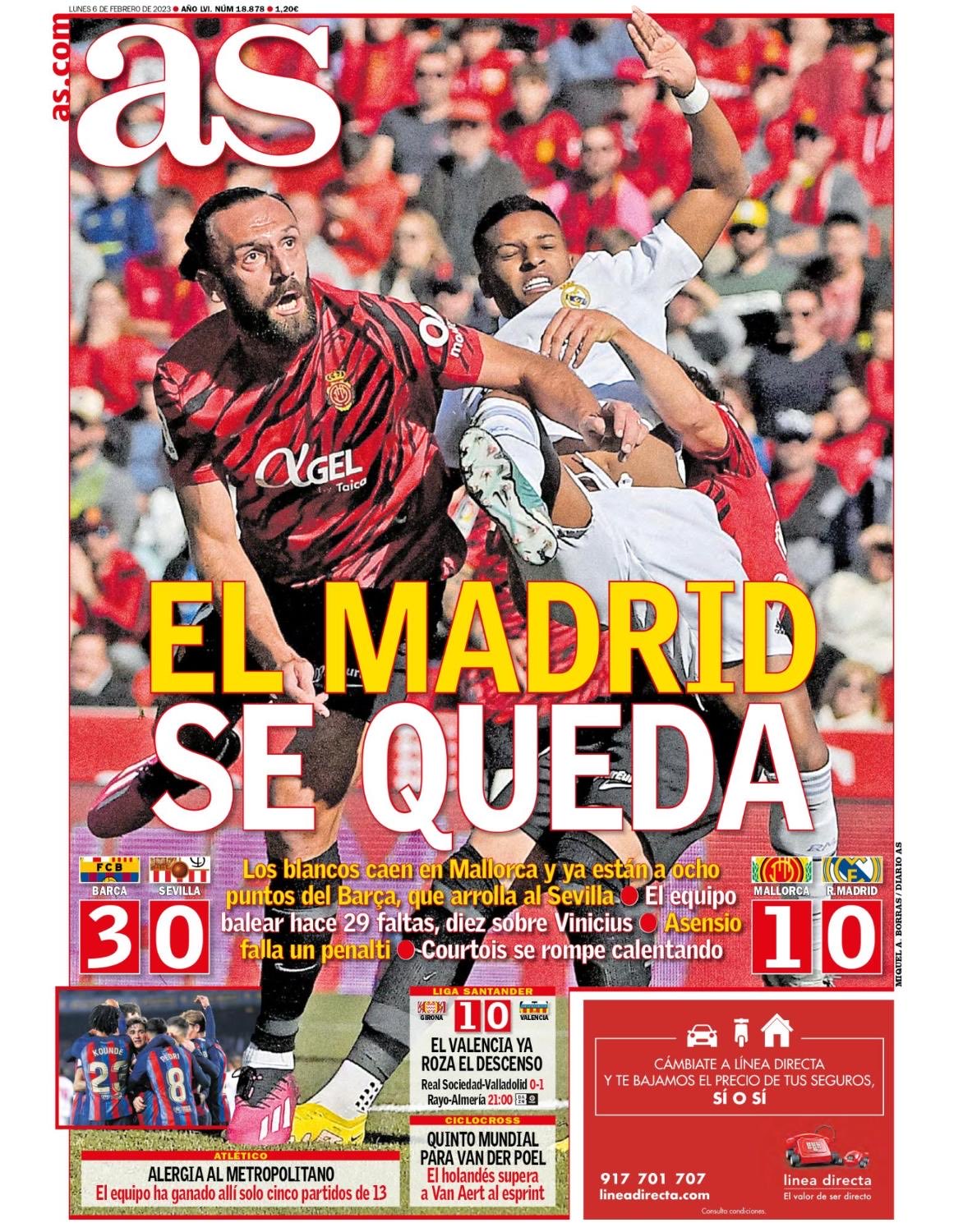 La portada de hoy del diario AS va enfocada a la derrota del Real Madrid en campo del Mallorca: "El Madrid se queda".
