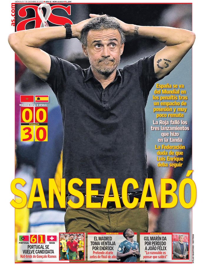 Como no podía ser de otra manera el Diario AS sale en portada con la decepción de España en el Mundial. "Sanseacabó", titula el periódico con Luis Enrique en el foco de la portada. En relación al Real Madrid, el periódico hace referencia al fichaje de Endrick. "El Madrid toma ventaja: pretende atarle antes de final de año", reza el titular.
