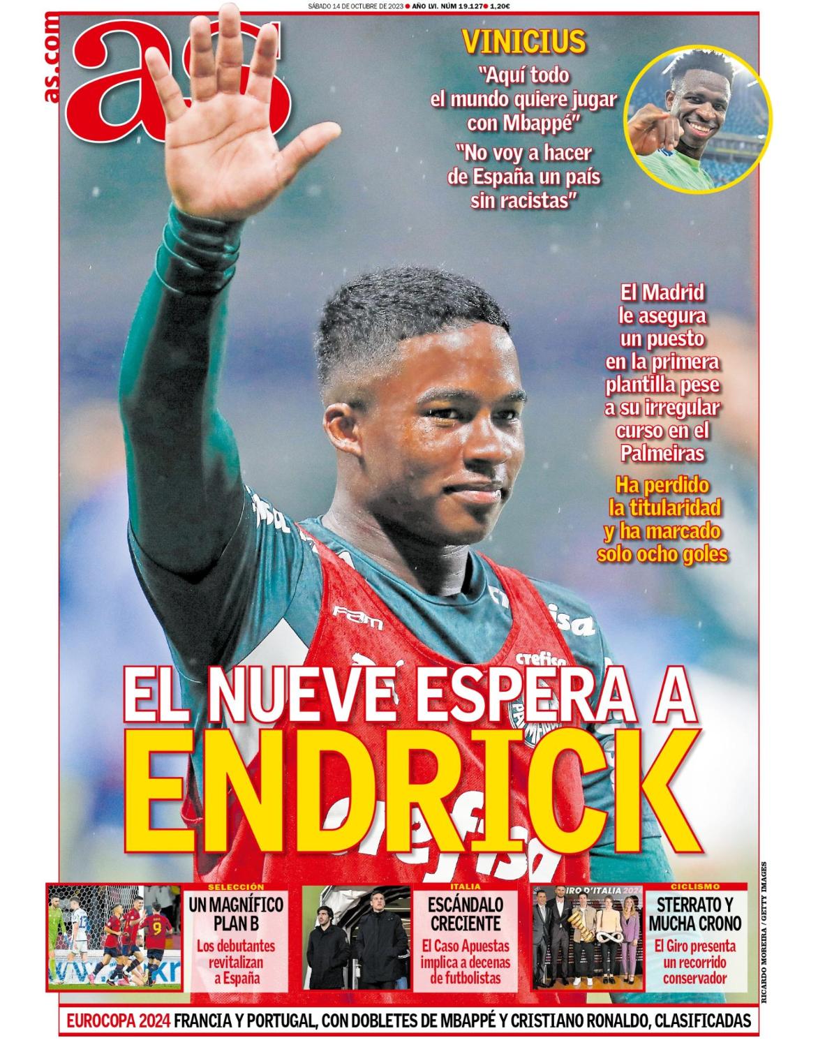En su edición de este sábado, la portada del diario AS viene protagonizada por Endrick, que tendrá sitio asegurado en la primera plantilla del Real Madrid la próxima temporada.