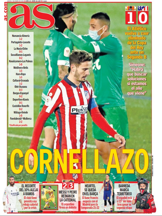 El diario as saca hoy en portada la sorprendente eliminación del Atlético de Madrid en Copa del Rey ante el UE Cornellá y también destaca el gran escollo de la renovación de Sergio Ramos con el Real Madrid: la rebaja salarial del 10% que quiere implantar el club para paliar la crisis económica provocada por el coronavirus.