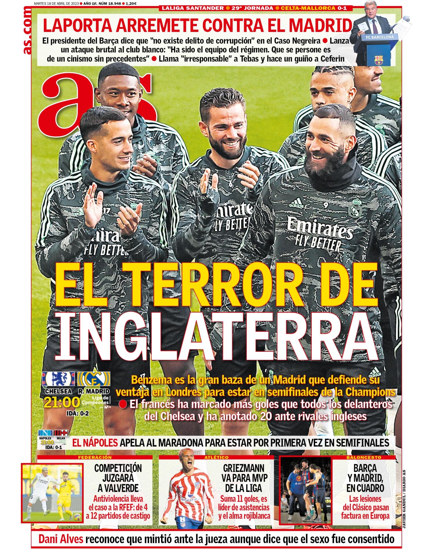 El diario as saca en portada a Karim Benzema y sus buenos registros ante equipos ingleses, contra los que ha sido capaz de marcar 20 goles. Este miércoles, en Stamford Bridge, el capitán del Real Madrid tratará de guiar nuevamente al conjunto blanco hacia unas nuevas semifinales de la Champions League.
