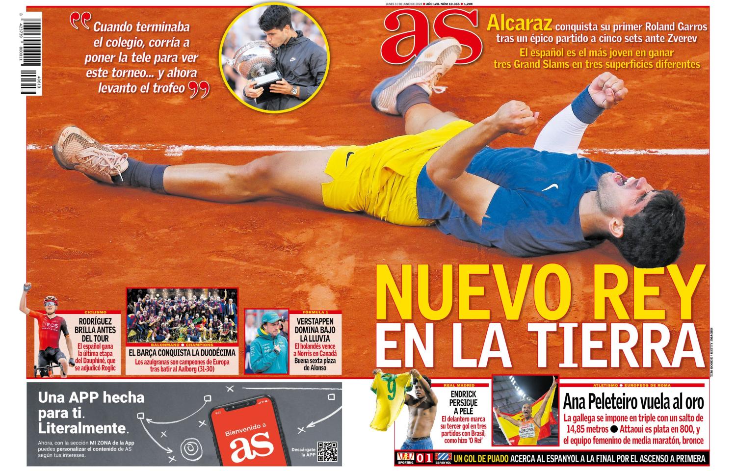 Este lunes 10 de junio de 2024, el diario as saca en portada la victoria de Carlos Alcaraz en Roland Garros, así como los goles de Endrick en sus primeros partidos con la selección absoluta de Brasil. Cifras goleadoras a la altura de Pelé.