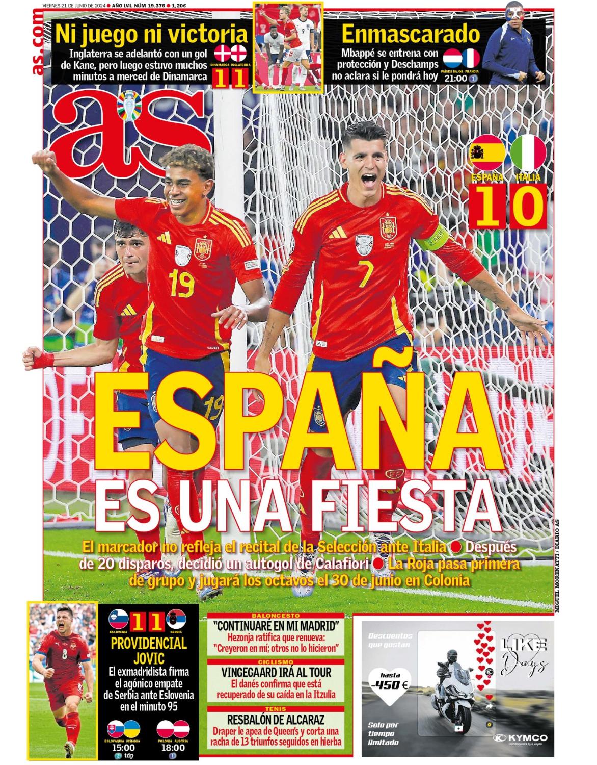 Este viernes 21 de junio de 2024, el diario as saca en portada el triunfo de la selección española frente a Italia. "España es una fiesta", titula el periódico.