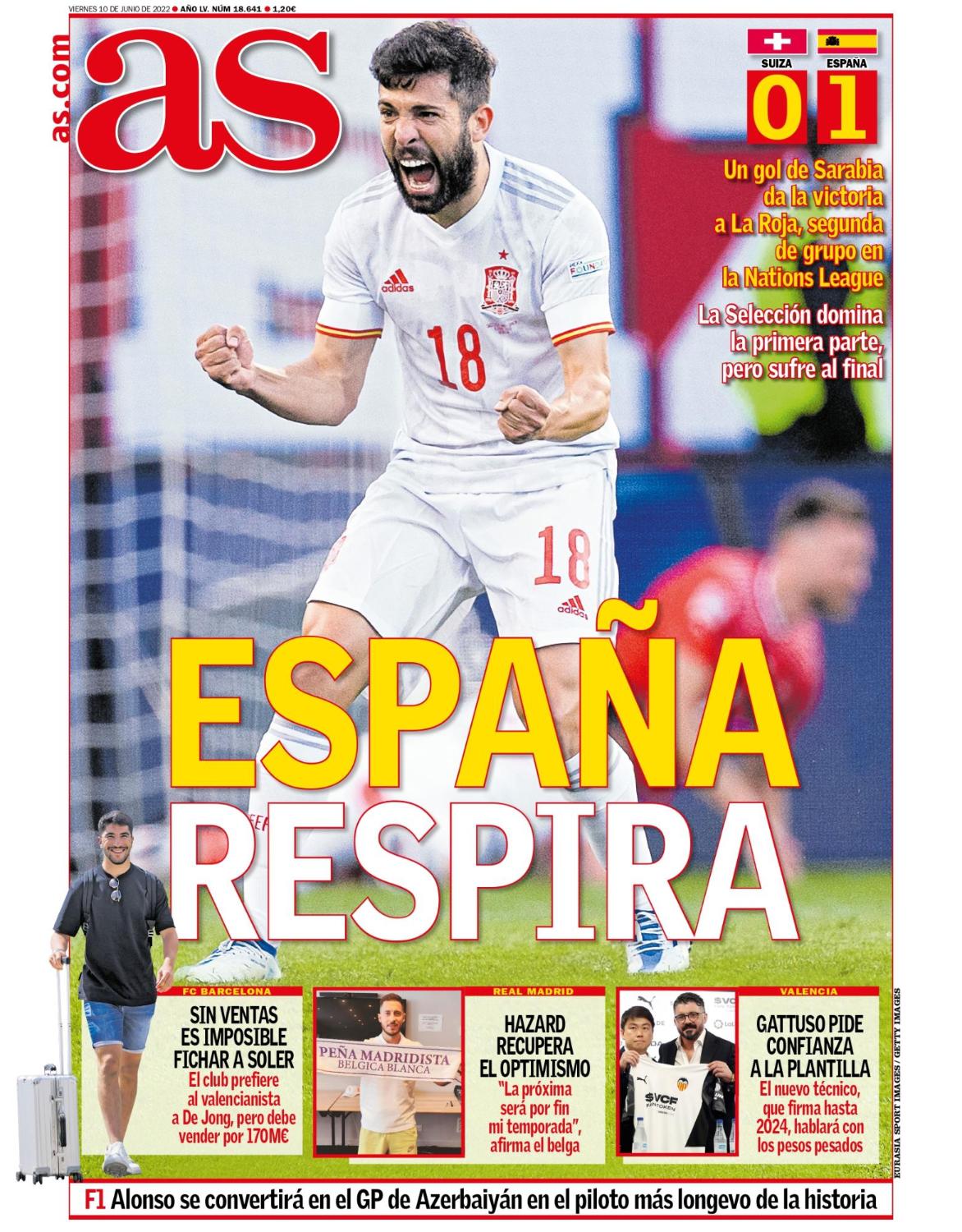 Este viernes, el diario as saca en portada la primera victoria de España en la Nations League ante Suiza, y el optimismo de Eden Hazard de cara a la próxima temporada.