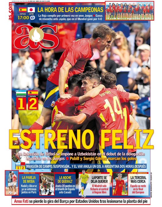 La portada del jueves del diario AS viene protagonizada por la victoria de la selección española de fútbol en su debut de los Juegos Olímpicos.