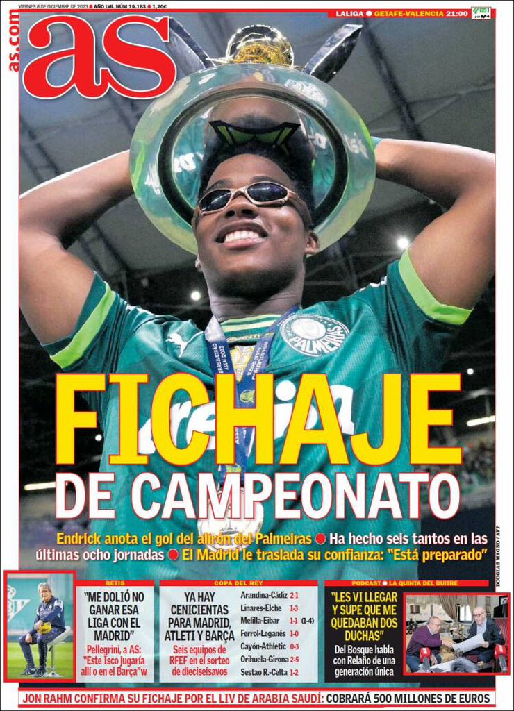 Este viernes 8 de diciembre, el diario as saca en portada a Endrick y su segundo Brasileirao con el Palmeiras. Un nuevo título de campeón de liga después de una temporada descomunal del jovencísimo delantero brasileño, propiedad del Real Madrid.