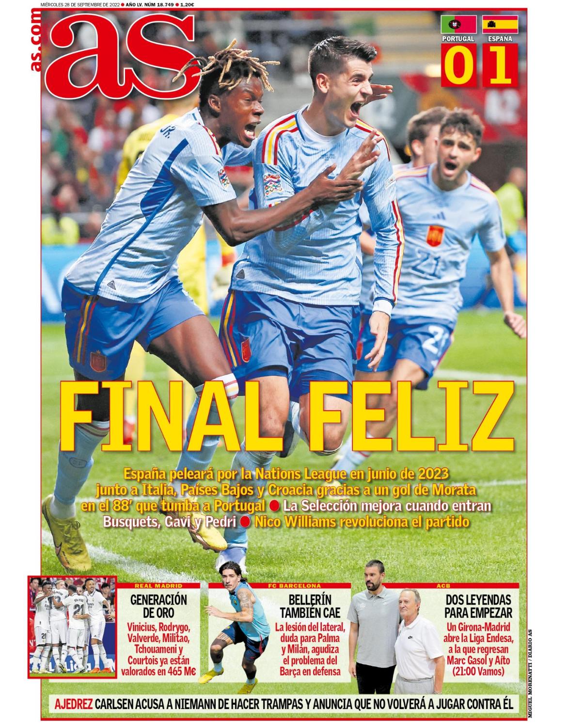 AS abre con la victoria de España contra Portugal. Álvaro Morata se disfrazó de héroe para mandar a los españoles a la 'Final Four' de la UEFA Nations League con un tanto en el 88'.