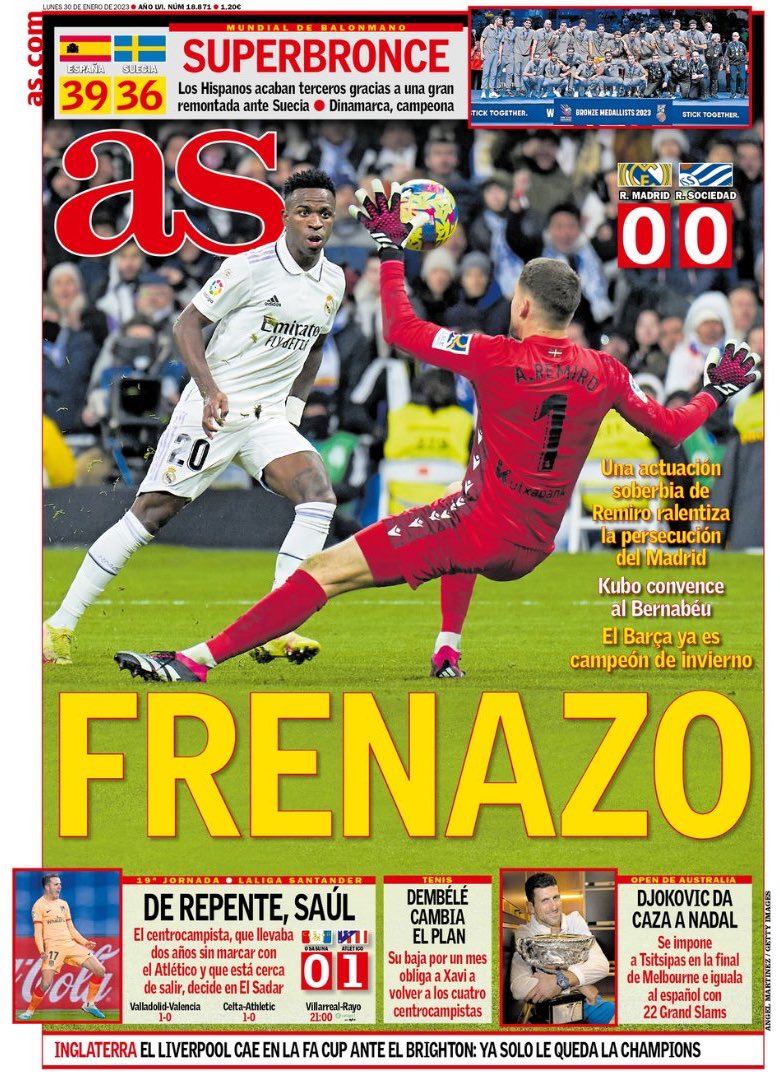 El diario AS presenta en su portada de hoy el "frenazo" a la buena racha del Real Madrid, al menos en cuanto a resultados, tras el empate ante la Real Sociedad.