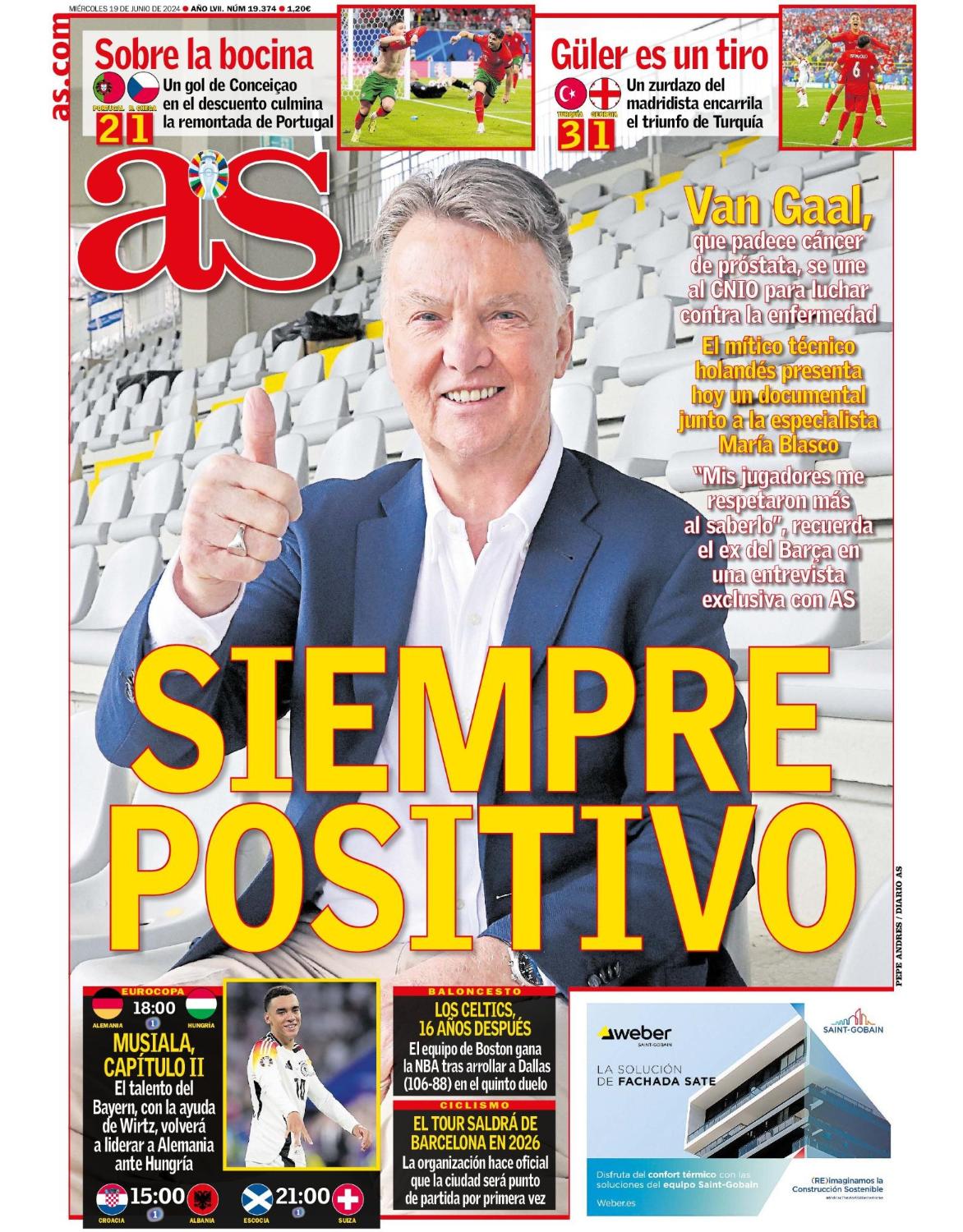 Este miércoles 19 de junio de 2024, el diario as saca en portada una entrevista exclusiva con Van Gaal, y destaca, en otros temas, la victoria de Turquía ante Georgia (3-1) con golazo de Arda Güler incluido.