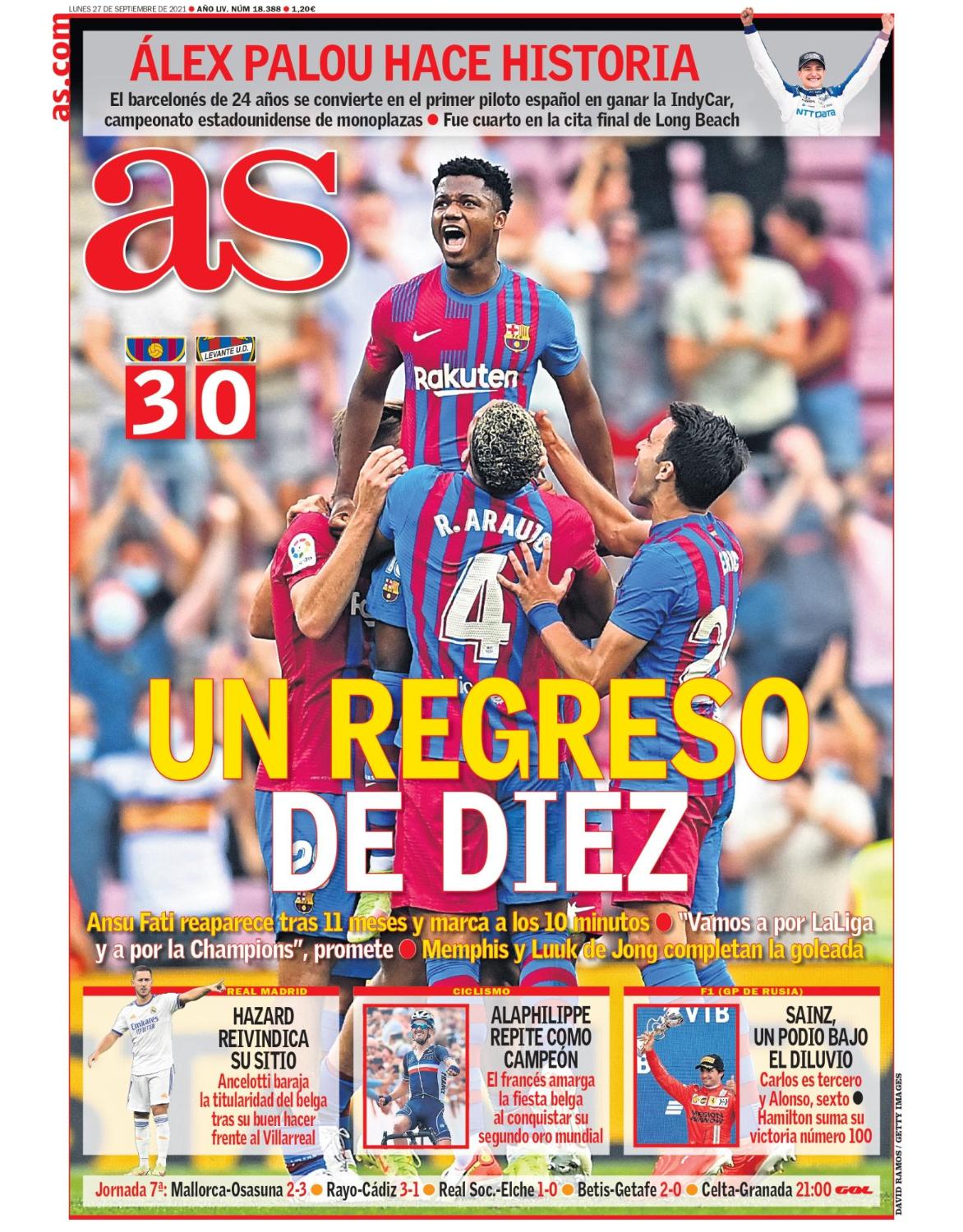 El diario AS presenta en su portada de hoy el regreso de Ansu Fati con gol en el Fútbol Club Barcelona. Además, mencionan que "Hazard reivindica su sitio" en el Real Madrid. Después del partido ante el Villarreal -y a pesar del empate sin goles- el belga mostró un buen nivel.