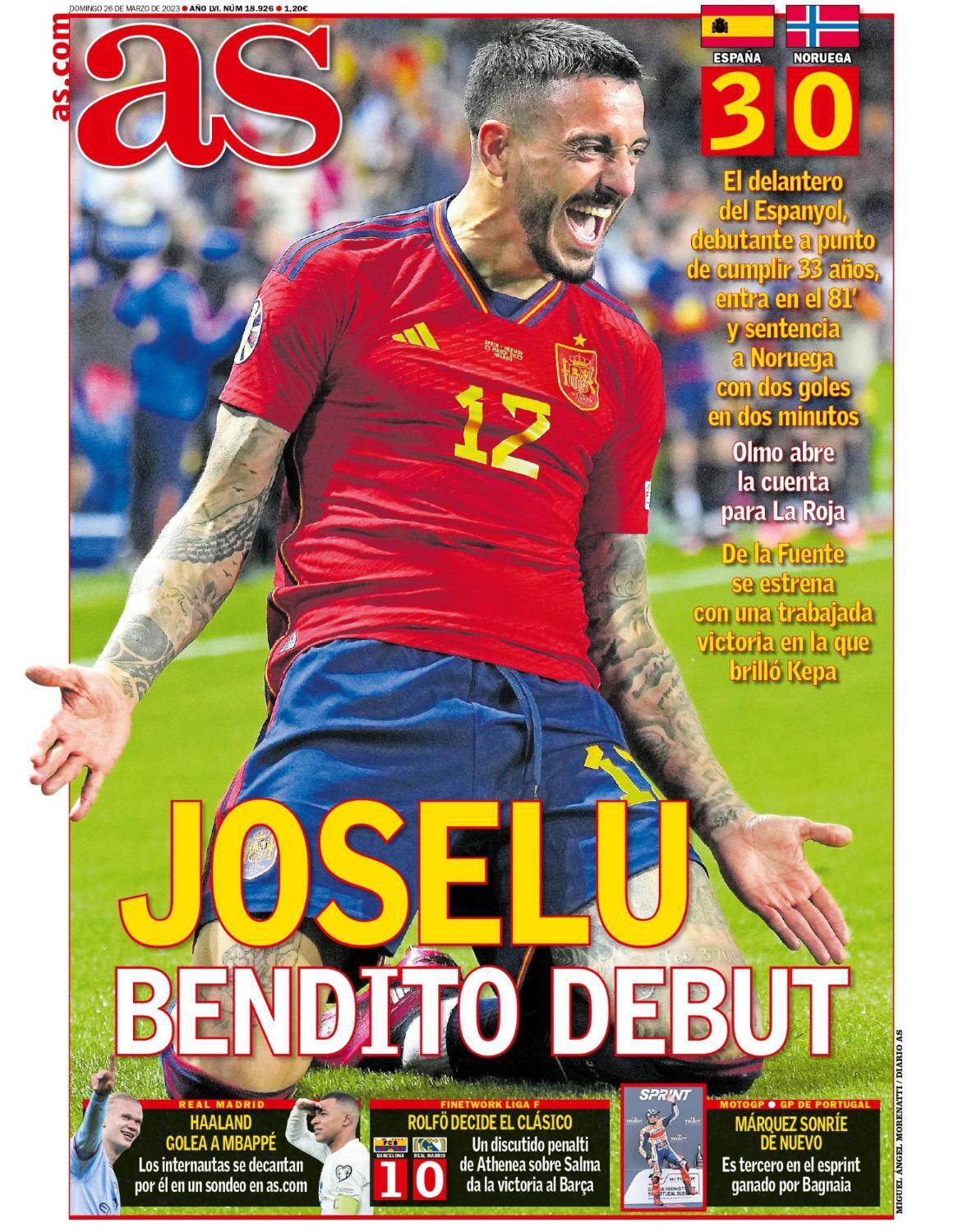 El diario As destaca en su edición matinal de este domingo la victoria de la selección española ante Noruega donde brilló Joselu. El exdelantero y canterano del Real Madrid debutó con la roja haciendo un doblete saliendo desde el banquillo.