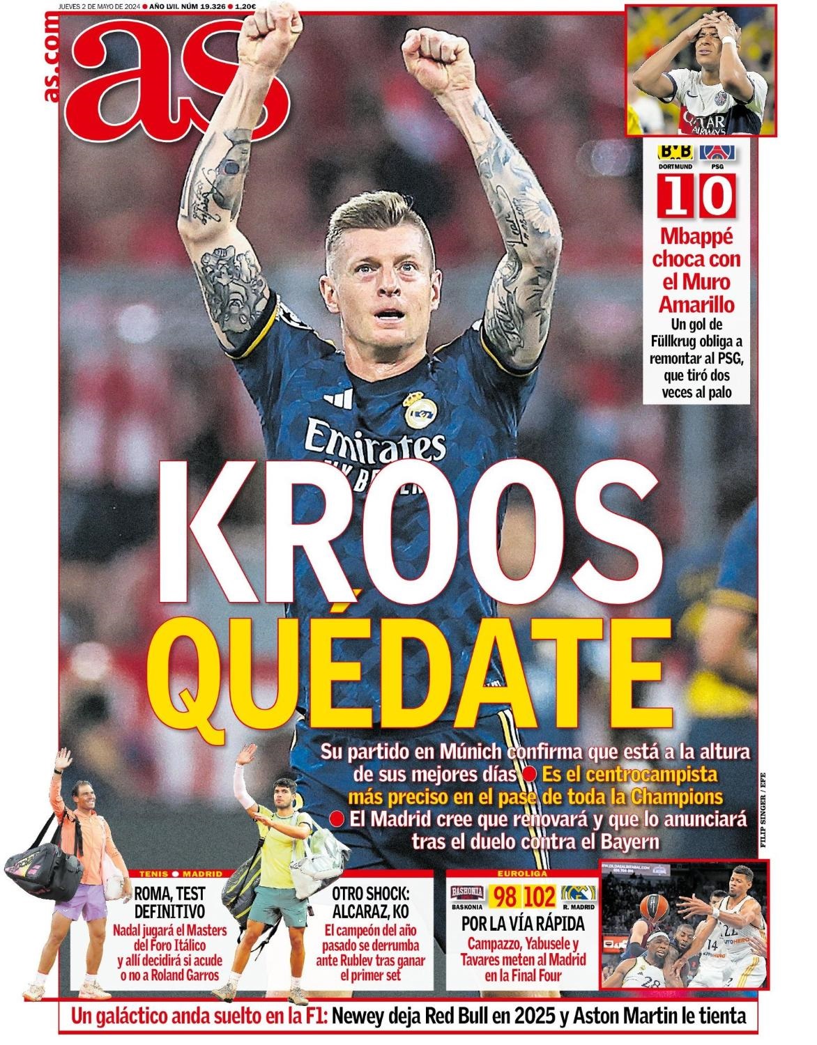 El diario AS destaca en su portada del jueves el gran nivel de un Toni Kroos que apunta a renovar con el Real Madrid hasta 2024.