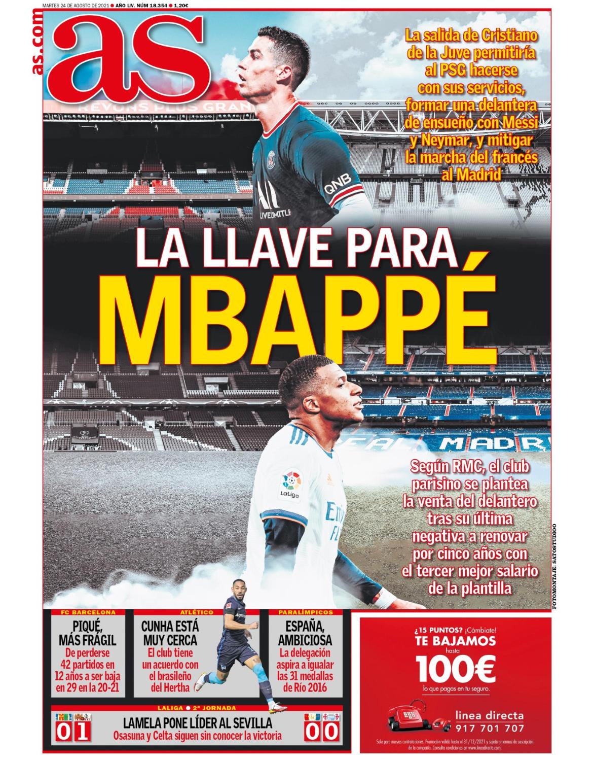 El diario as saca hoy en portada a un Cristiano Ronaldo que puede ser "la llave para Mbappé". El crack portugués quiere dejar la Juventus y vería con buenos ojos fichar por el Paris Saint-Germain, lo que facilitaría el traspaso de Kylian al Real Madrid.