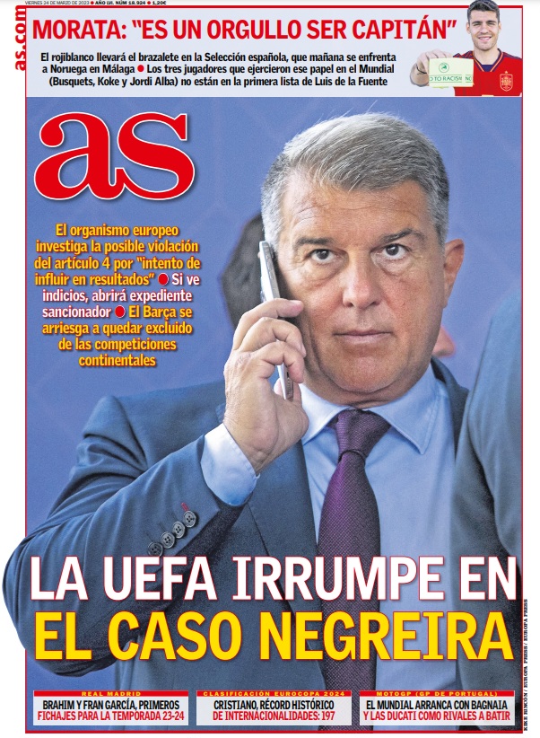 Para este viernes 23 de marzo de 2023, el diario as destaca en su portada la irrupción de la UEFA en el caso Negreira.