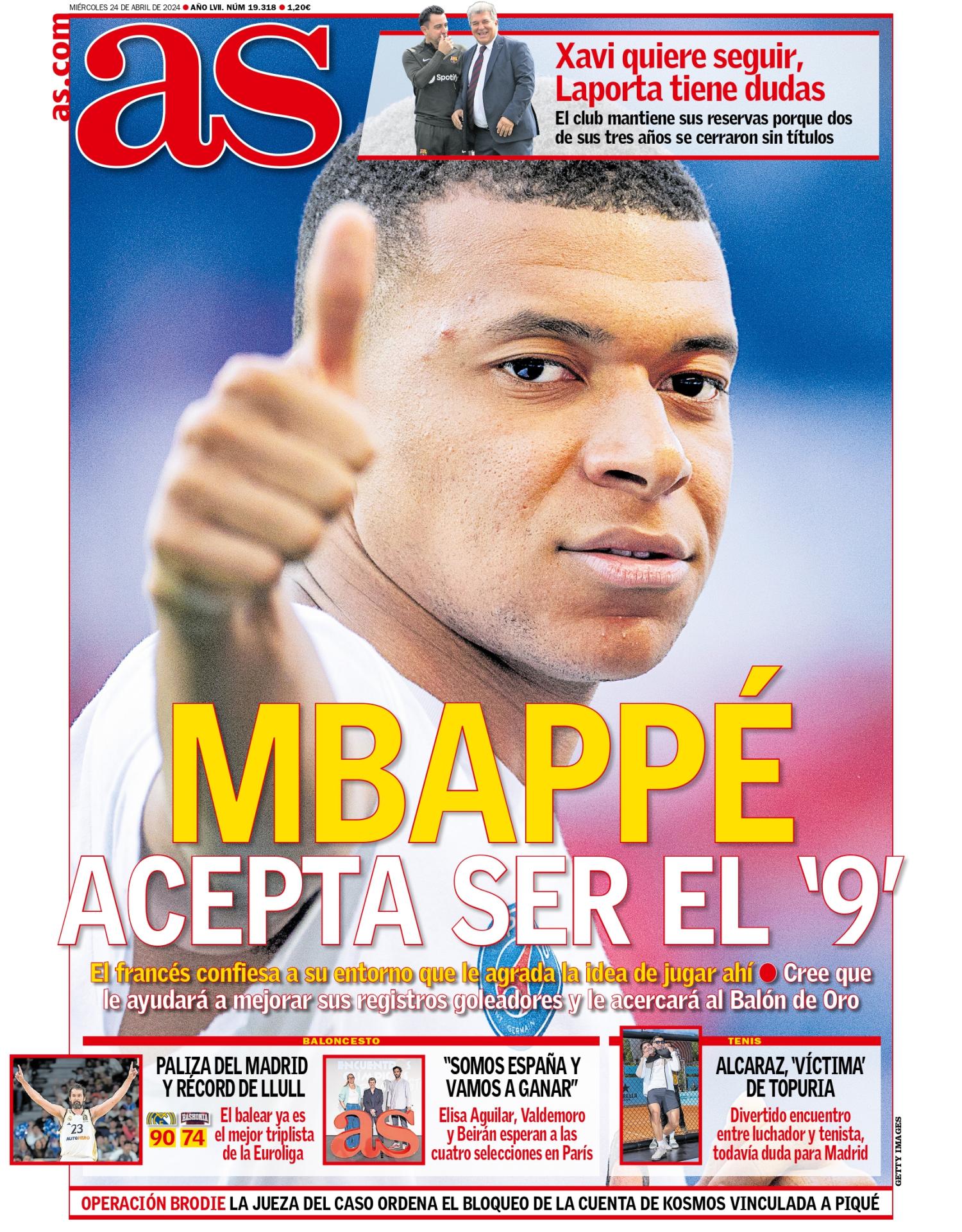 Este miércoles 24 de abril de 2024, el diario as lleva en portada a un Kylian Mbappé que habría aceptado jugar de delantero centro en el Real Madrid.
