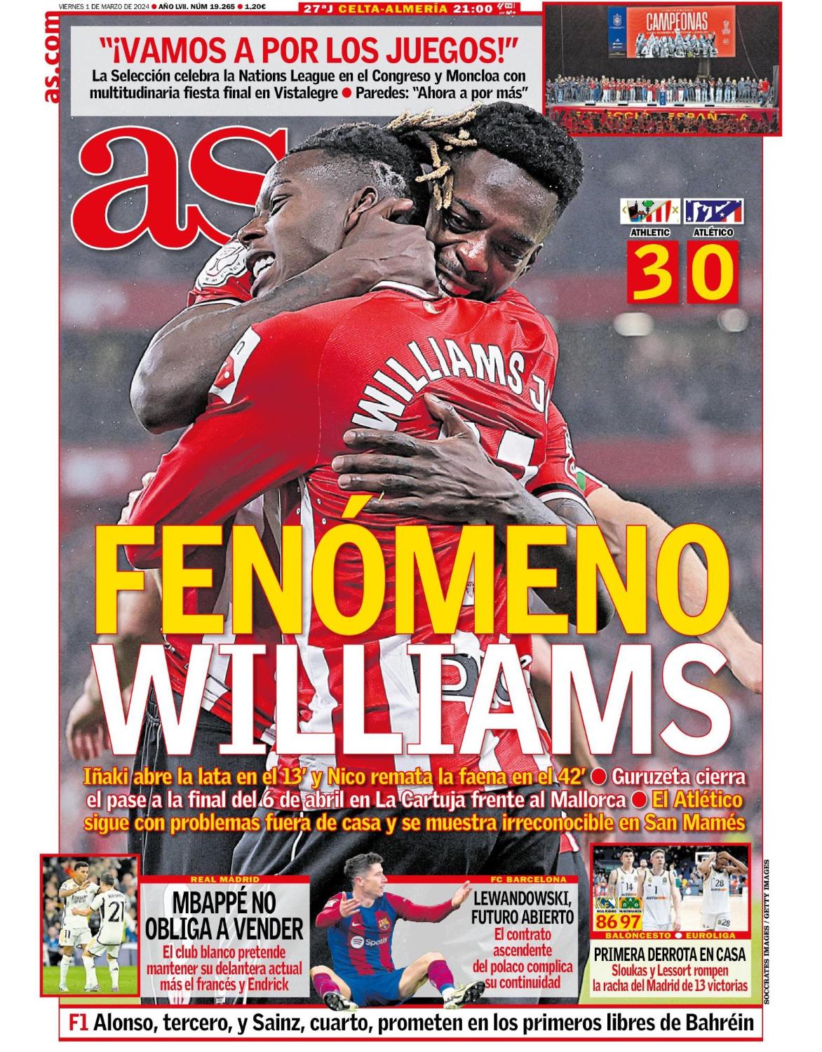 Este viernes 1 de marzo de 2024, el diario as saca en portada la victoria del Athletic frente al Atlético en Copa del Rey. Además, en primera plana, el periódico también asegura que el Real Madrid no venderá a ningún futbolista, pese a las incorporaciones de Endrick y Mbappé este verano.
