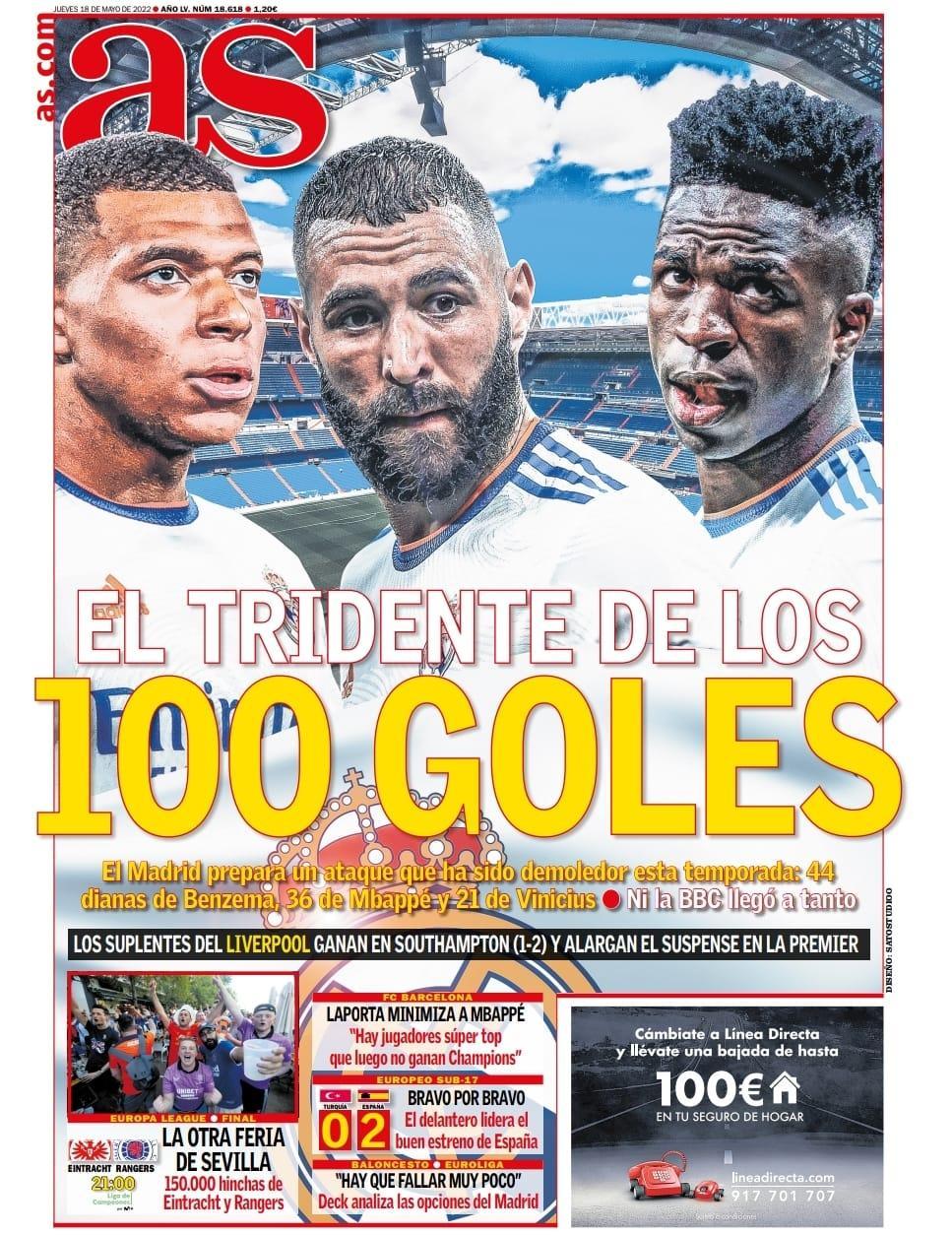 PORTADA | As: "Mbappé, Vinicius y Benzema, el tridente de los 100 goles"
