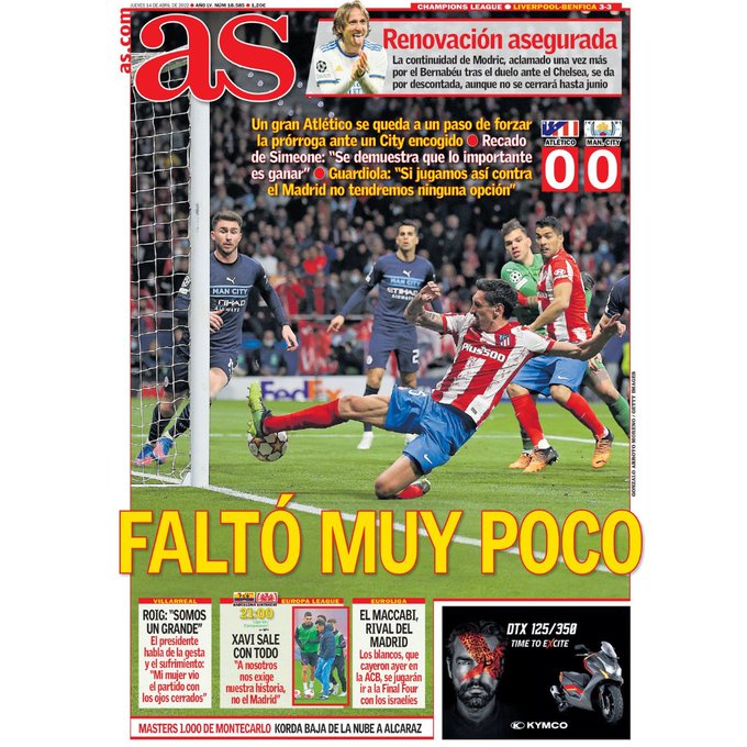 En su edición del jueves, la portada del diario AS abre con la eliminación del Atlético de Madrid a manos del Manchester City, que será el próximo rival del Real Madrid. Asimismo, el periódico madrileño señala que la de Luka Modric con el conjunto blanco es una "renovación asegurada".