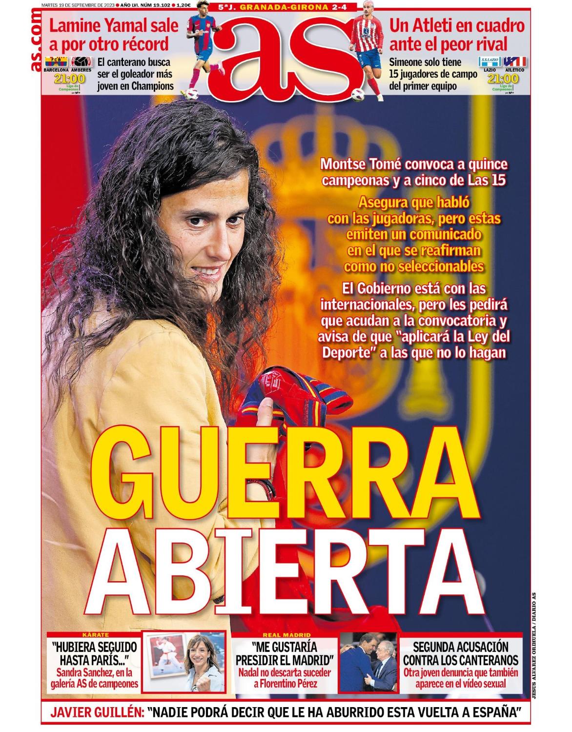 Este martes 19 de septiembre, el diario as saca en portada la "guerra abierta" que hay entre la selección femenina de fútbol y la RFEF, a raíz de la última convocatoria de Montse Tomé. Asimismo, el periódico también destaca las declaraciones de Rafa Nadal, confesando que le gustaría ser presidente del Real Madrid.