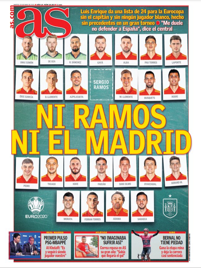 AS también se hace eco, como no podía ser de otra forma, de la ausencia de Sergio Ramos en la Eurocopa. Luis Enrique, seleccionador nacional de España, prescinde del capitán de la Selección. Además, resaltan las declaraciones de Nasser-Al Khelaifi sobre el futuro de Kylian Mbappé: "es y seguirá siendo jugador nuestro".