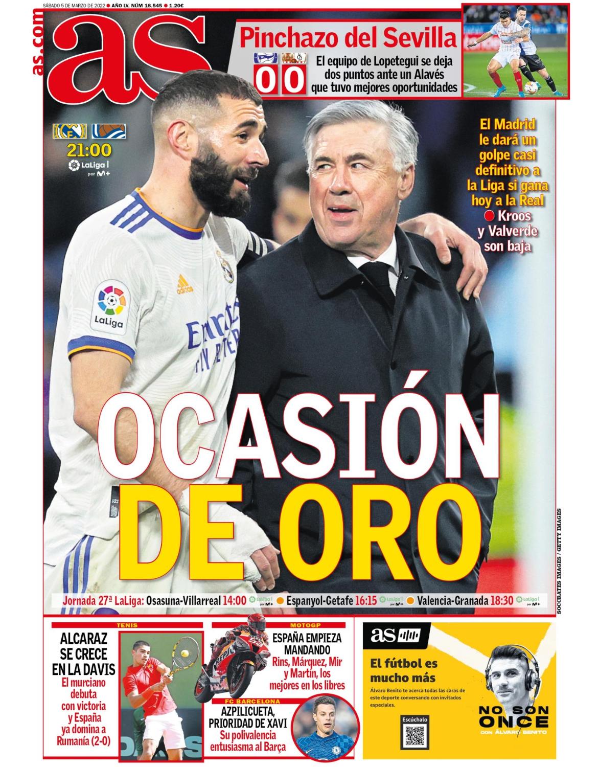 El diario as saca hoy en portada a Benzema y Ancelotti, que tienen que ser fundamentales en el partido del Real Madrid mañana ante la Real Sociedad, ya que si se consiguiera la victoria, aumentaríamos la renta de distancia con el Sevilla en dos puntos. Kroos por la microrrotura es baja y duda contra el PSG, mientras que Valverde se encuentra en la misma situación para mañana, pero por una gripe, así que Camavinga será clave.