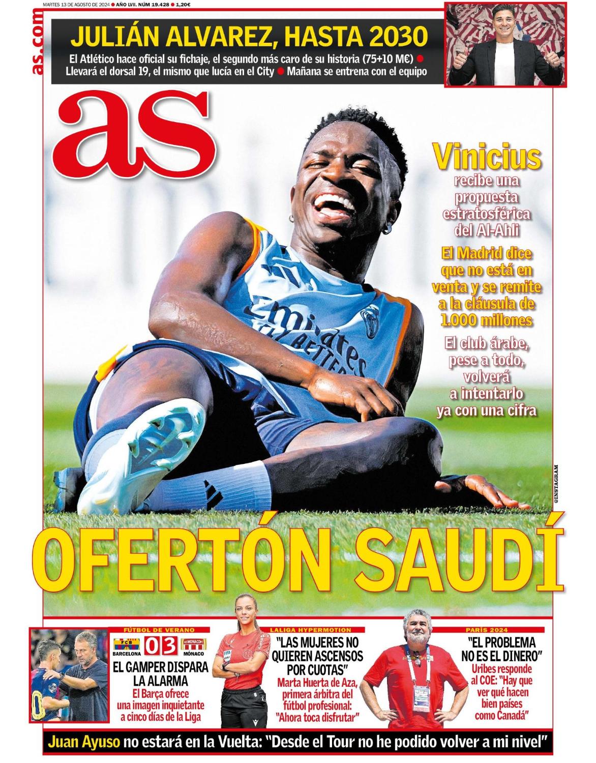 El diario As publica en su portada el ofertón de Arabia Saudí para hacerse con Vinicius. También destacan la llegada de Julián Álvarez al Atlético de Madrid.