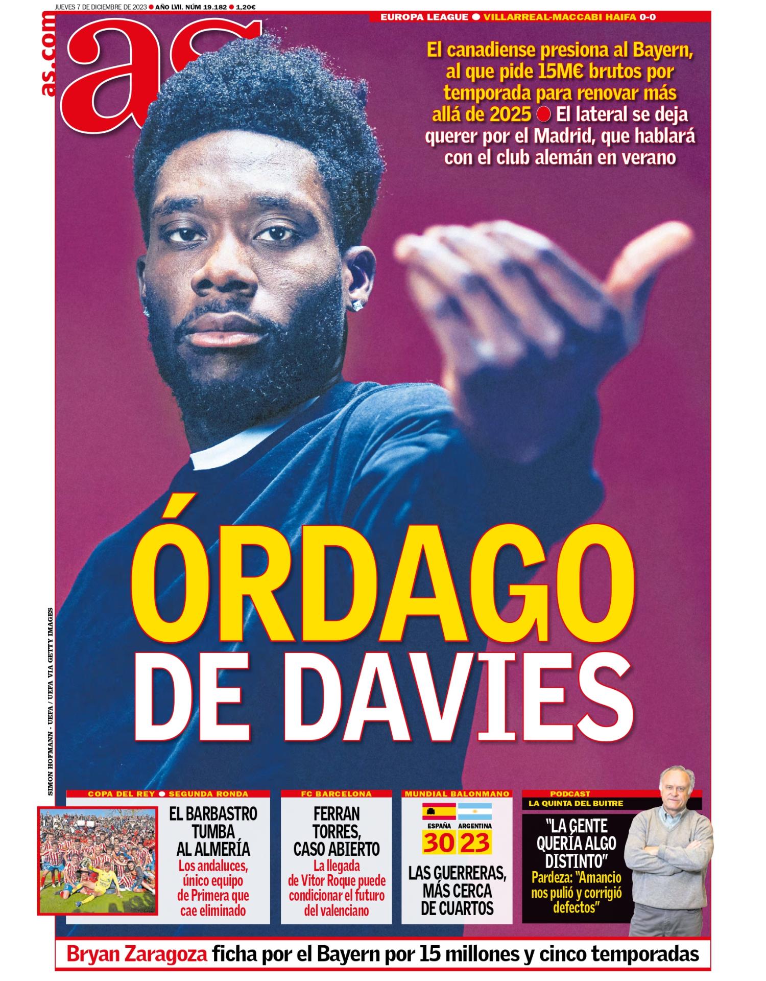 El diario AS presenta en su portada de hoy a Alphonso Davies y el "órdago" que ha lanzado al Bayern Múnich para no fichar por el Real Madrid.