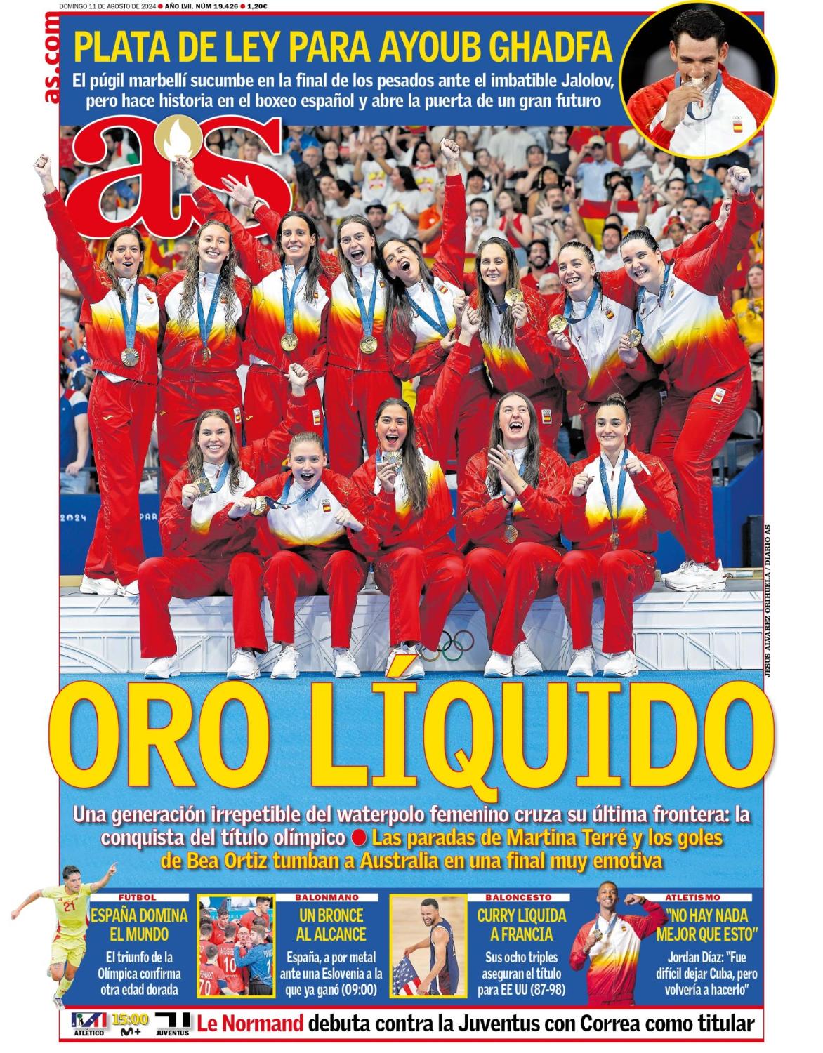 Este domingo 11 de agosto de 2024, el diario as saca en portada el oro olímpico del waterpolo femenino.