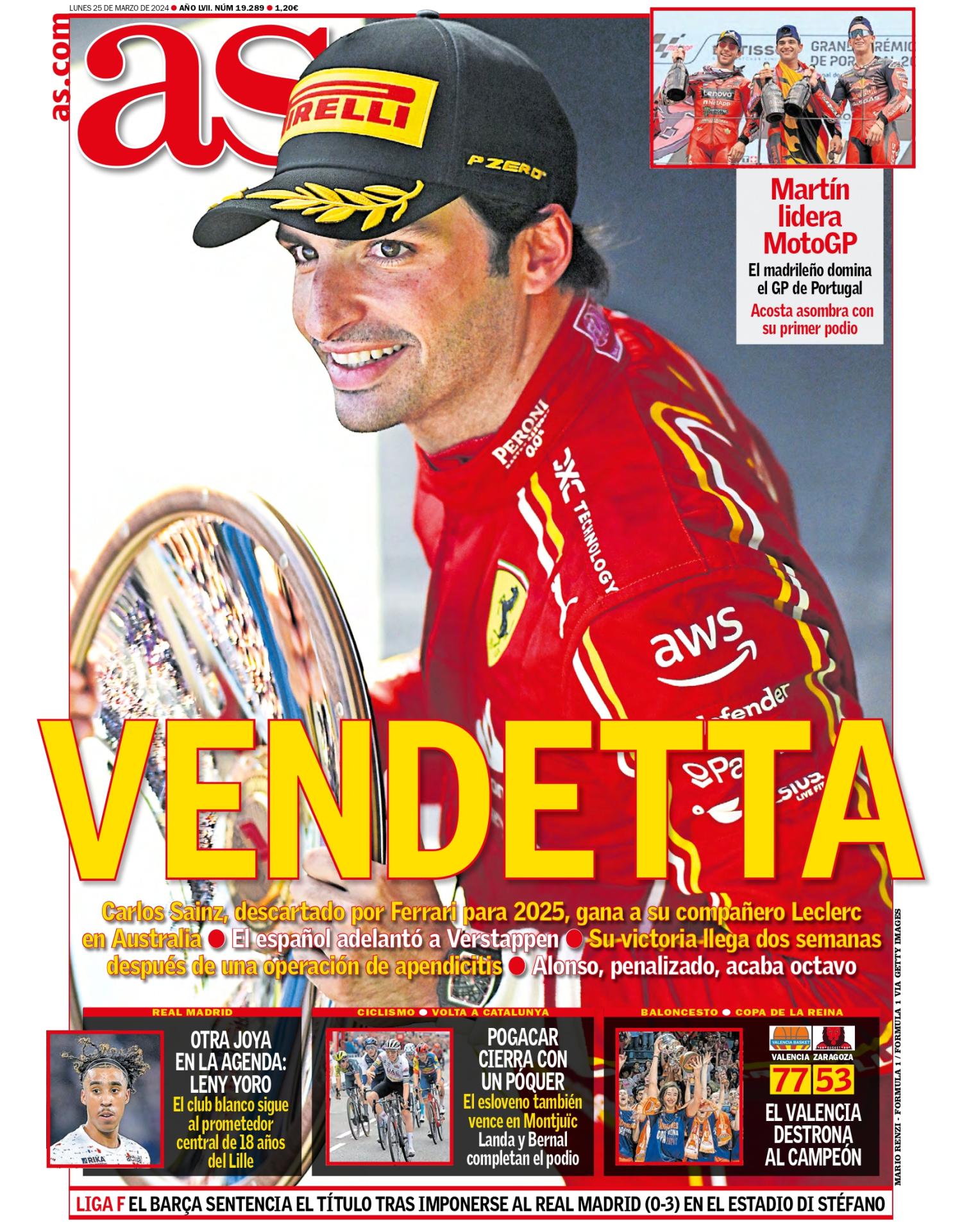 Este lunes 25 de marzo de 2024, el diario as saca en portada la victoria de Carlos Sainz en el Gran Premio de Australia, y destaca también el interés del Real Madrid en el fichaje de Leny Yoro.