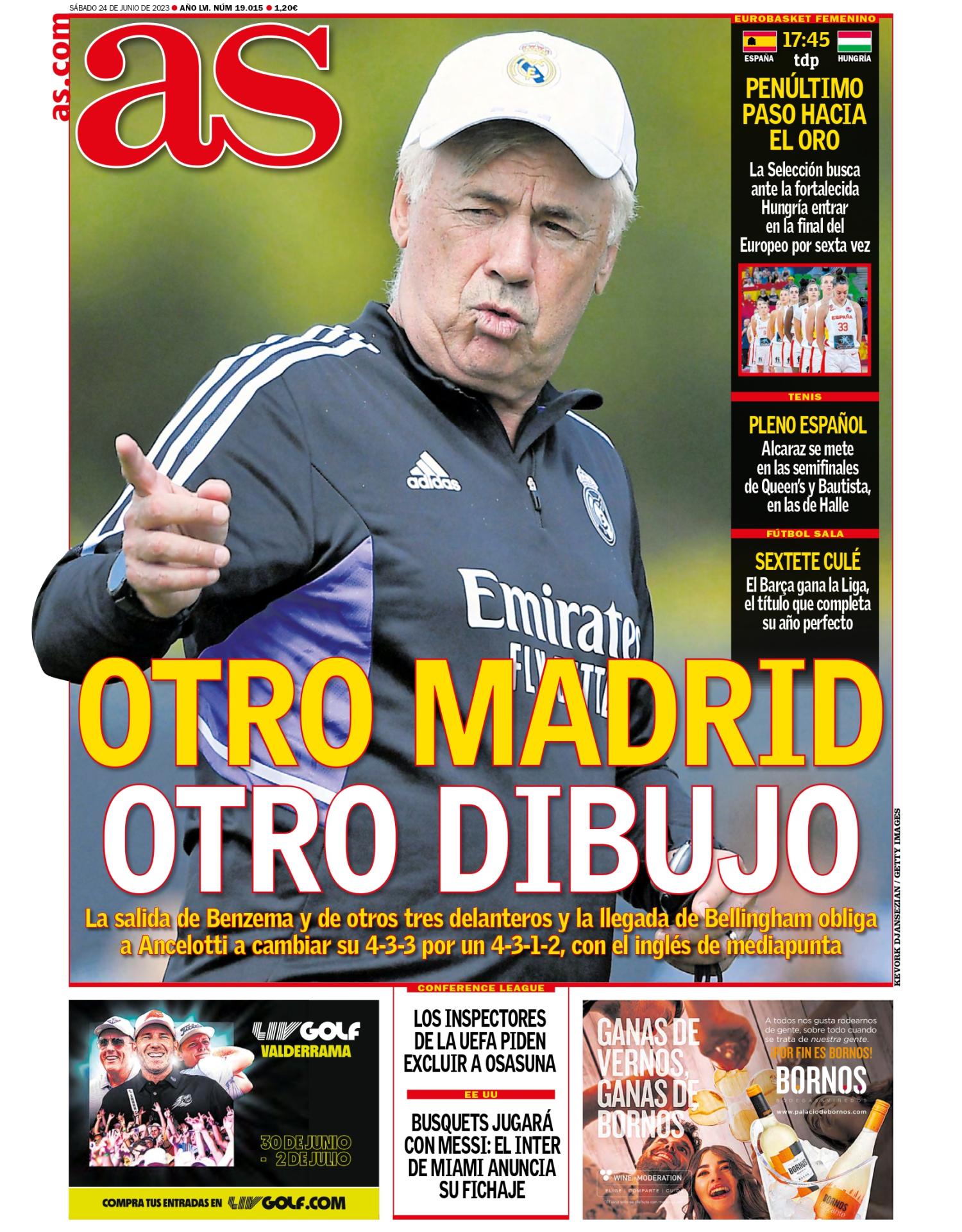 En su edición de este sábado, la portada del diario AS abre con el posible cambio de esquema que valora Carlo Ancelotti para el Real Madrid 2023-24.