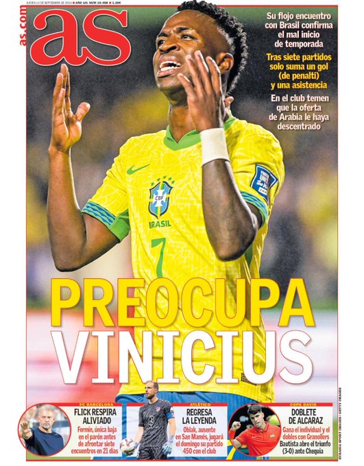 En su portada del jueves, el diario AS destaca cierta preocupación por Vinicius dado su discreto inicio de temporada con el Real Madrid y con Brasil.