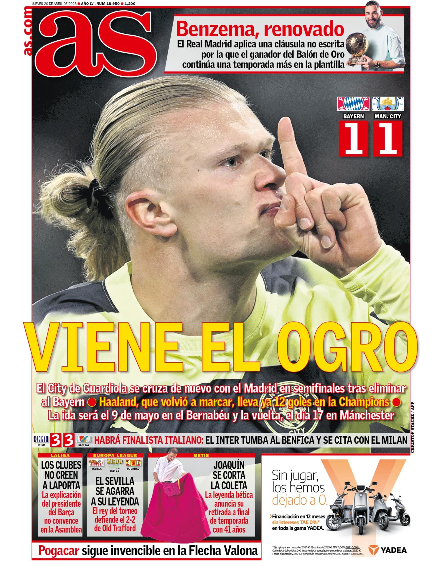 AS también destaca el Real Madrid - Manchester City de semifinales de Champions League. Blancos y citizens se medirán a un paso de Estambul tras vencer a Chelsea y Bayern en sus respectivos cuartos de final.