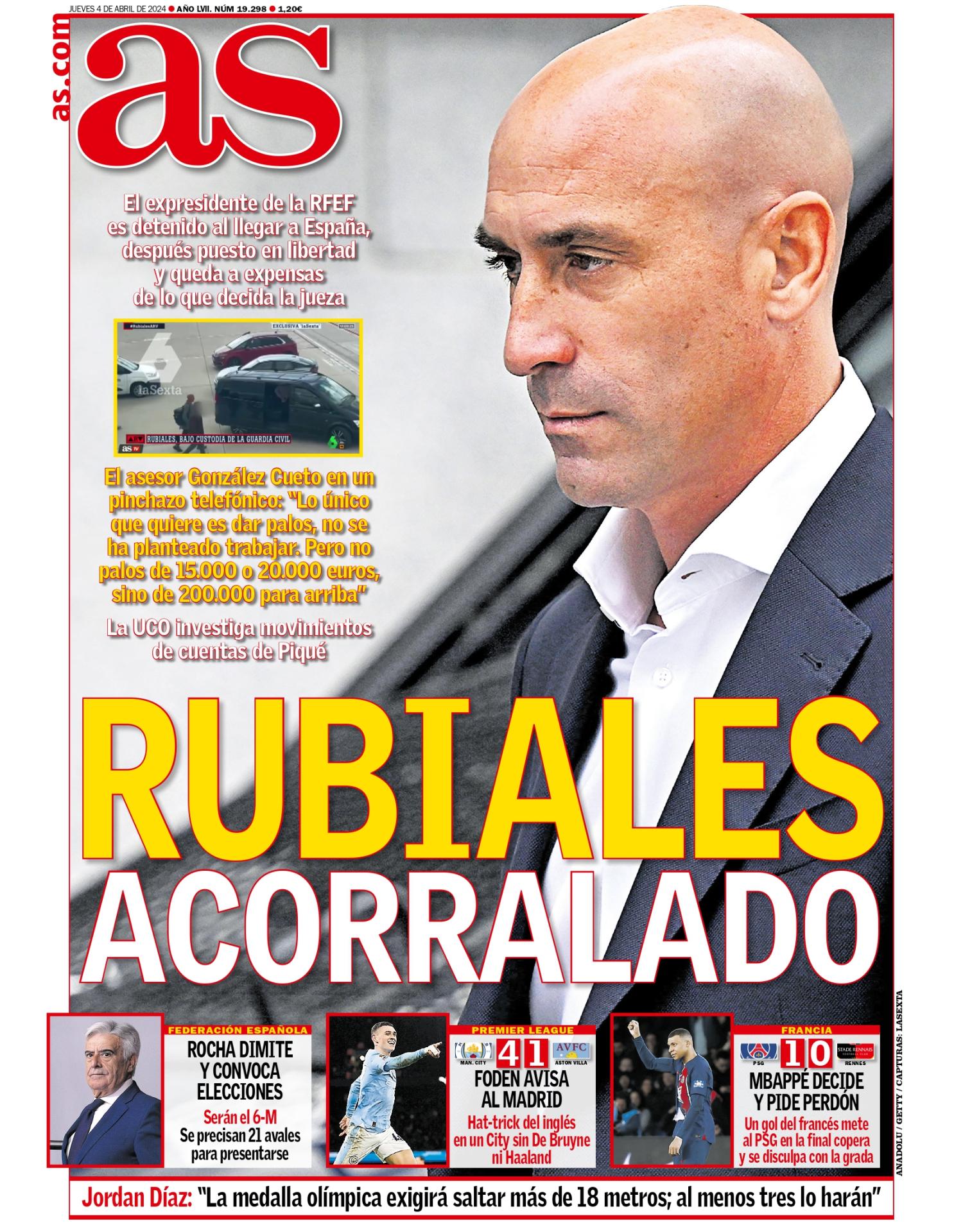 El diario As destaca en su portada con la imputación del expresidente de la RFEF, Luis Rubiales, tras ser detenido en España.