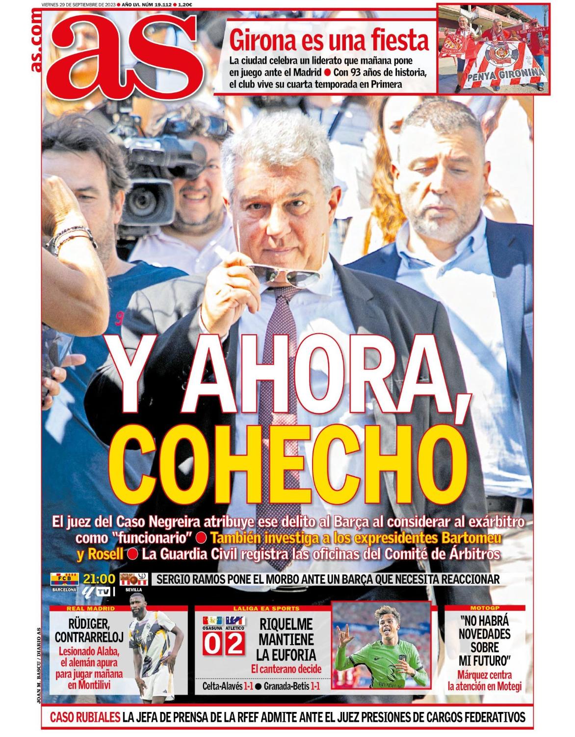 Este viernes 29 de septiembre, el diario as saca en portada la imputación del FC Barcelona por cohecho, en relación al caso Negreira; y también destaca a un Antonio Rüdiger que acabó tocado el último partido ante Las Palmas y que trabaja a contrarreloj para poder estar disponible en la próxima jornada en Girona (sábado 18:30 horas).