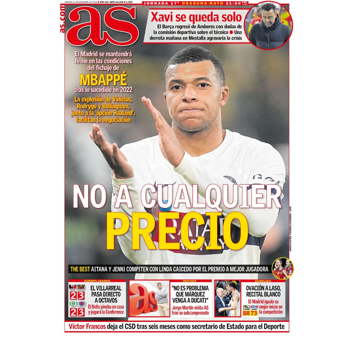 En su portada para este viernes 15 de diciembre, el diario as señala que el Real Madrid no fichará a Mbappé a cualquier precio, después de lo que pasó en 2022.