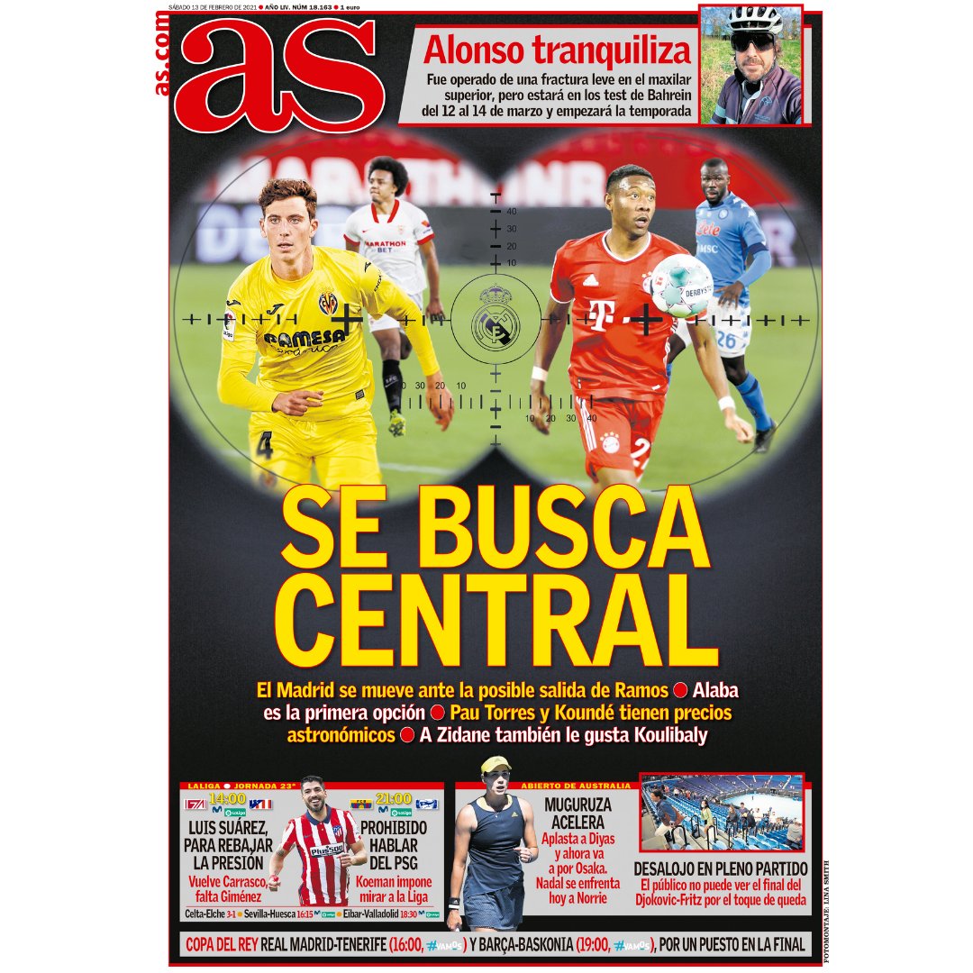 El diario AS abre este sábado con la búsqueda de un nuevo central por parte del Real Madrid. Los blancos rastrean el mercado en busca de un central que sustituya a Sergio Ramos en caso de que abandone la entidad madridista a final de temporada. El favorito es Alaba, mientras que Koundé y Pau Torres tienen precios astronómicos. Por último, a Zidane le gusta Koulibaly.