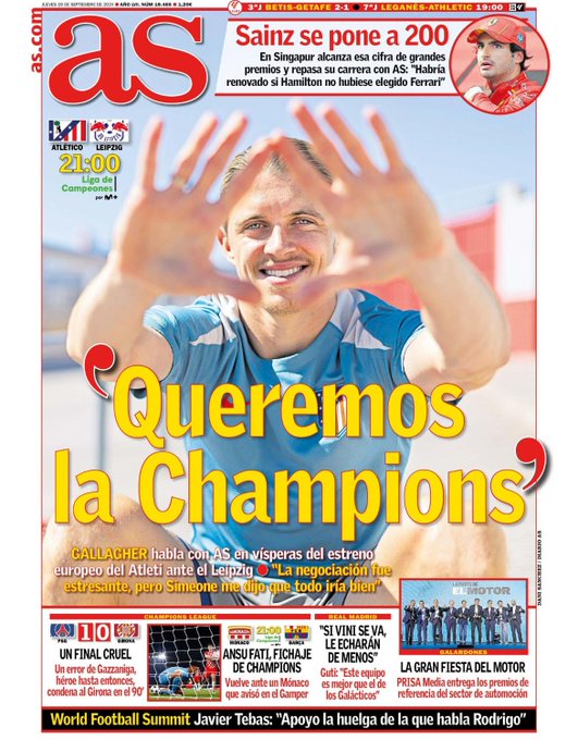 En su edición este jueves, el diario AS abre portada con una entrevista exclusiva a Gallagher, futbolista del Atlético. Asimismo, destaca unas declaraciones de Guti: "Si Vini se va, le echarán de menos".