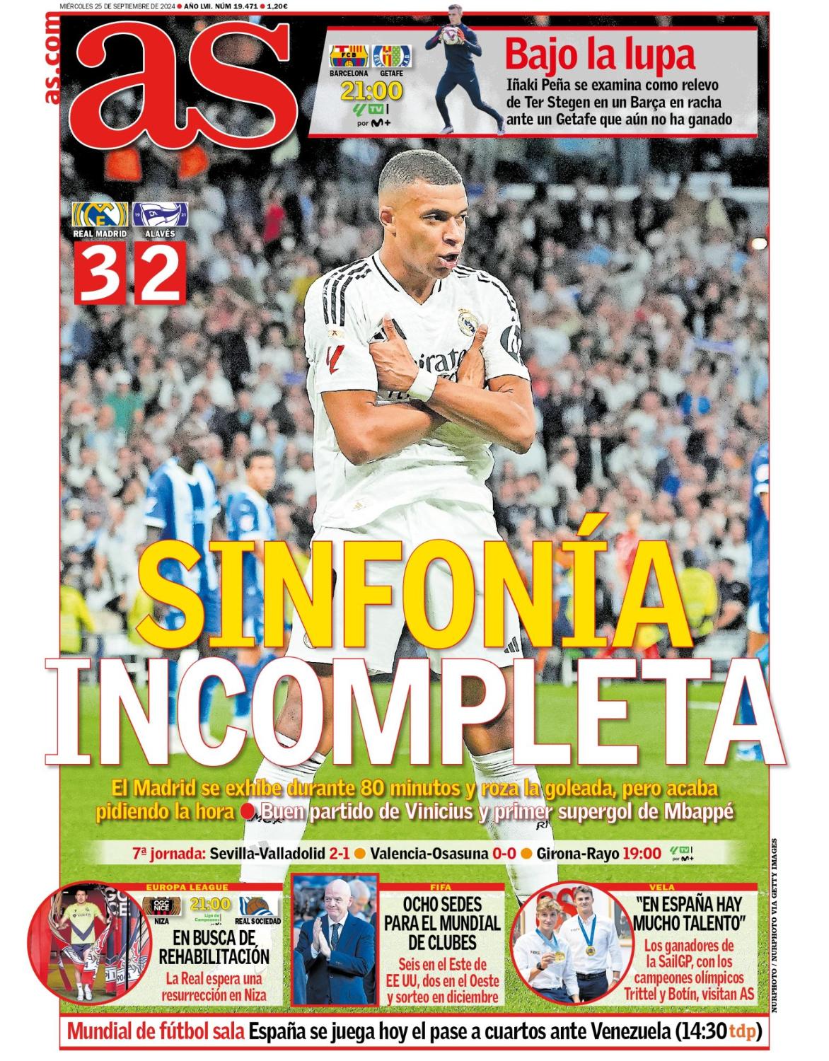 El diario As destaca en su portada la victoria del Real Madrid ante el Alavés en un gran partido con un final más que dubitativo después de encajar dos goles en apenas dos minutos.