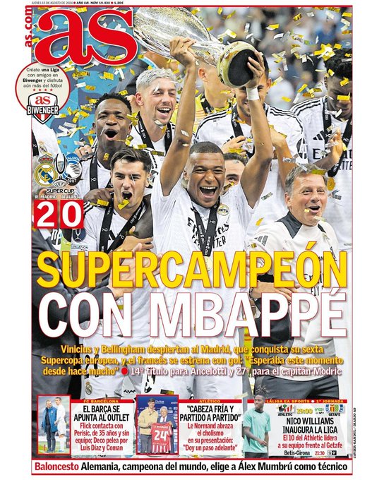 Como no podía ser de otra forma, el diario AS destaca en su portada de este jueves la Supercopa de Europa.