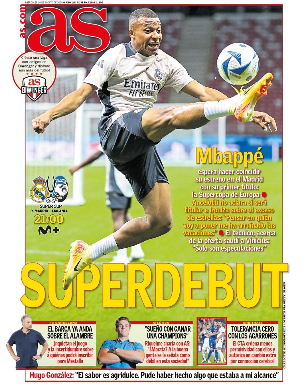 El diario As publica en su portada el debut de Kylian Mbappé con la previa de la Supercopa de Europa que el Real Madrid disputará ante la Atalanta.