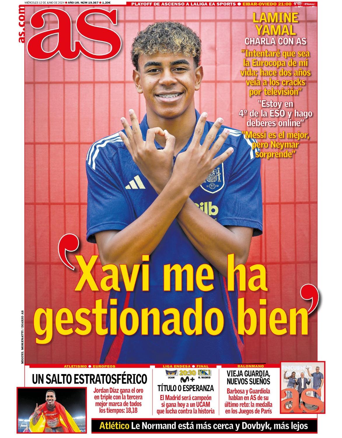 Este miércoles 12 de junio de 2024, el diario as saca en portada una entrevista con Lamine Yamal, y destaca también el tercer partido de la final de Liga Endesa entre el Real Madrid y el UCAM Murcia, que podría decantar la balanza en favor de los blancos.