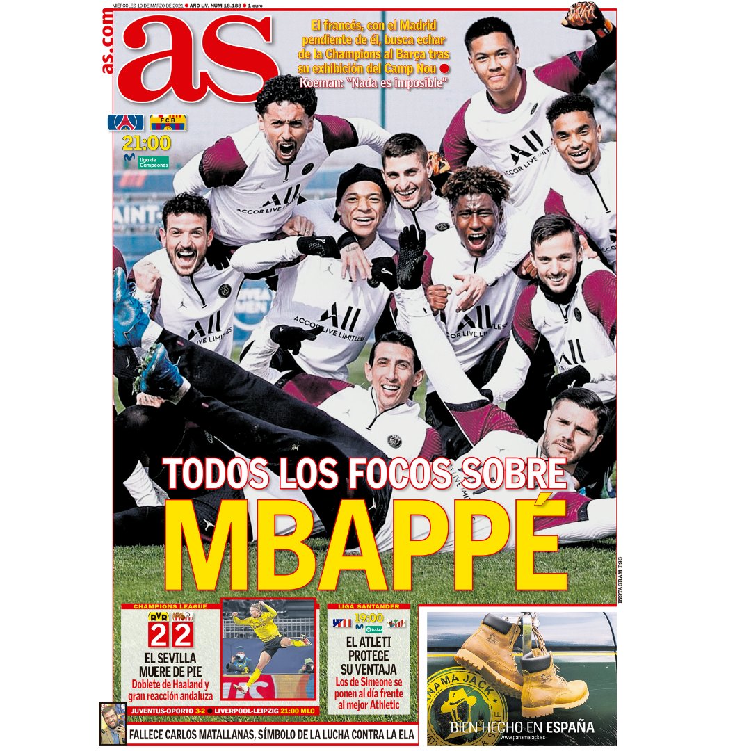 El diario as saca hoy en portada a un Paris Saint-Germain que busca darle la puntilla al FC Barcelona y eliminarle de la Champions League con un Kylian Mbappé que estará bajo la atenta mirada del Real Madrid.