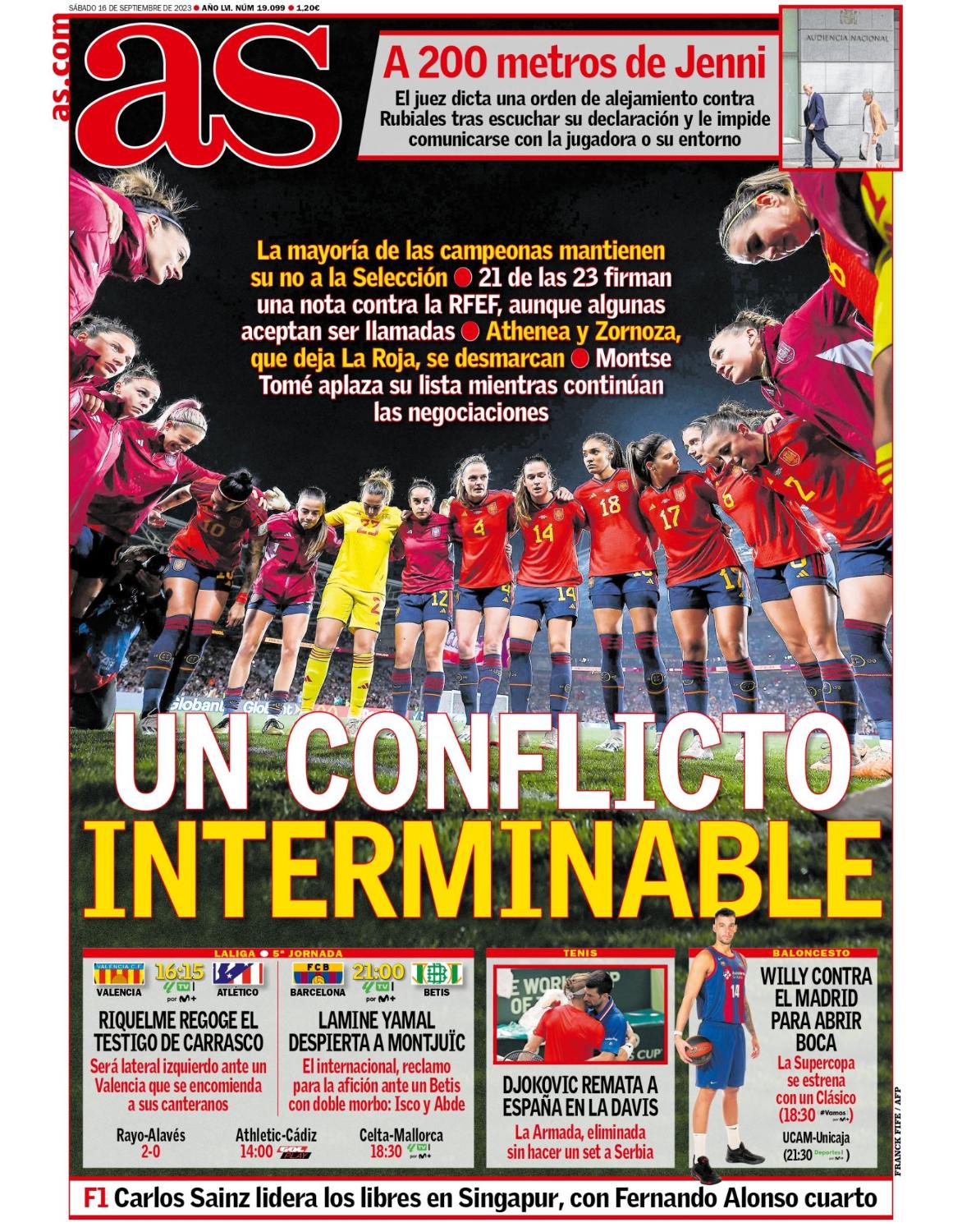 Este sábado 16 de septiembre, el diario as saca en portada el "conflicto interminable" entre la gran mayoría de las jugadoras de la selección española de fútbol femenino y la Federación.