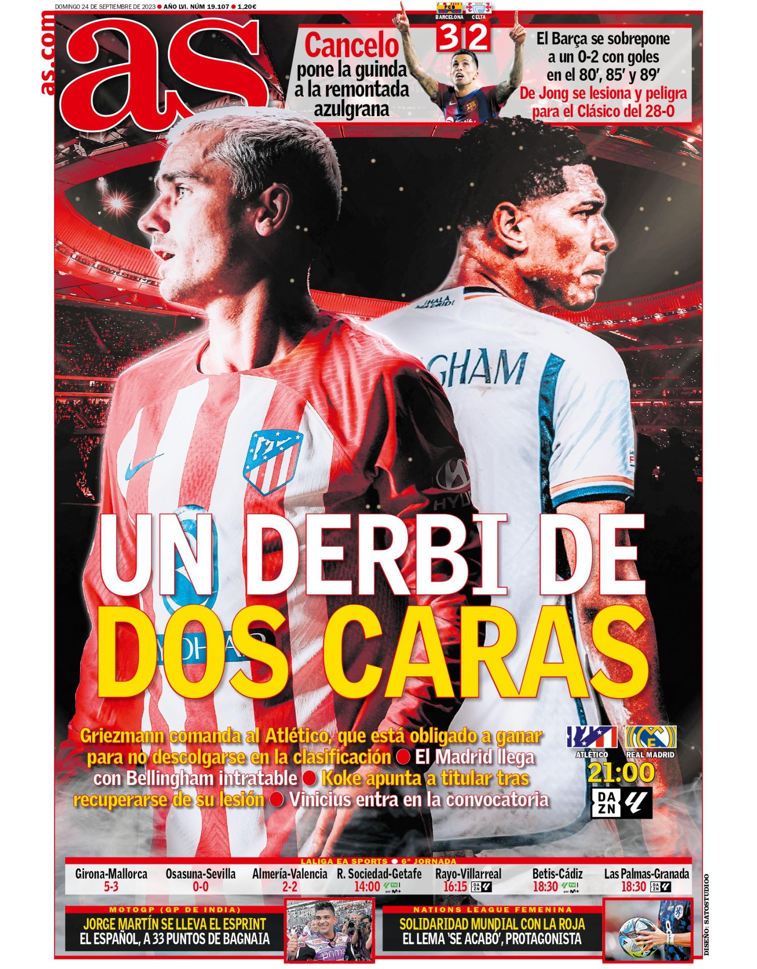 El diario As publica en su portada de este domingo la previa del derbi entre el Atlético de Madrid y el Real Madrid. Ambos equipos se enfrentan en un momento con dinámicas muy distintas donde los merengues son líderes destacados e invictos y los colchoneros necesitan los 3 puntos.