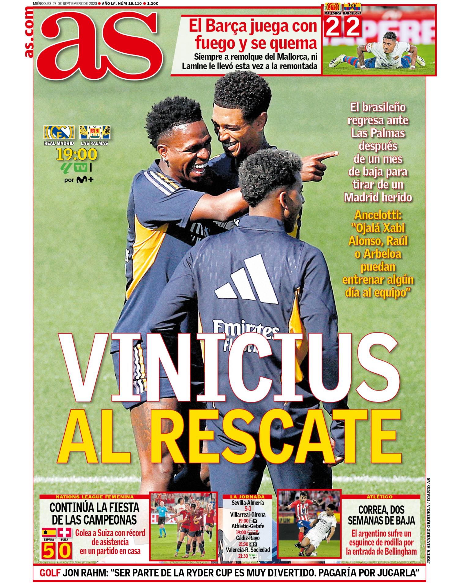 El diario As abre su portada con la recuperación de Vinicius, quien podrá jugar tras un mes fuera de los terrenos de juego y con el objetivo de que el Real Madrid vuelva conseguir la victoria.