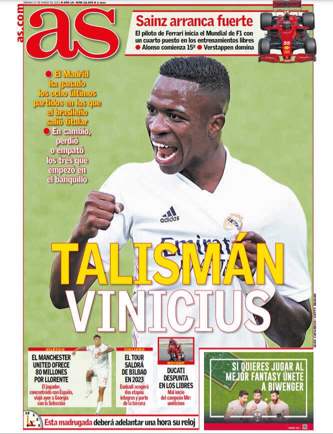 El diario As sale hoy en portada con el siguiente titular: "Vinicius talismán". Al parecer, cuando el brasileño juega los blancos ganan. De hecho, los últimos ocho encuentros donde ha estado el extremo el Madrid ha ganado todos. Por otro lado, los partidos donde salió desde el banquillo, los de Zidane dejaron de ganar.