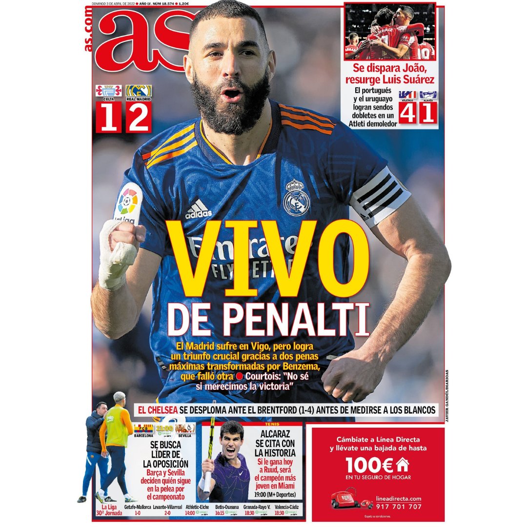 El diario as saca en portada para este sábado a Karim Benzema en una celebración de los penaltis anotados en la victoria del Real Madrid frente al Celta de Vigo. Por otro lado, también destacan unas declaraciones de Courtois sobre si merecieron ganar el partido. Por último, mencionan el batacazo del Chelsea frente al Brentford, perdiendo por 1-4.