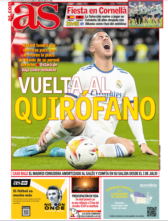 El diario as saca en su portada para este viernes a Eden Hazard y su vuelta al quirófano para operarse de la retirada de su placa de titanio en su peroné derecho. El belga estará de baja en torno a cinco semanas, por lo que se le podría dar por descartado para los últimos compases de las competiciones. Por otro lado, el Real Madrid considera a Gareth Bale como amortizado y ya solo espera darle salida el 1 de julio, cuando acaba su contrato.