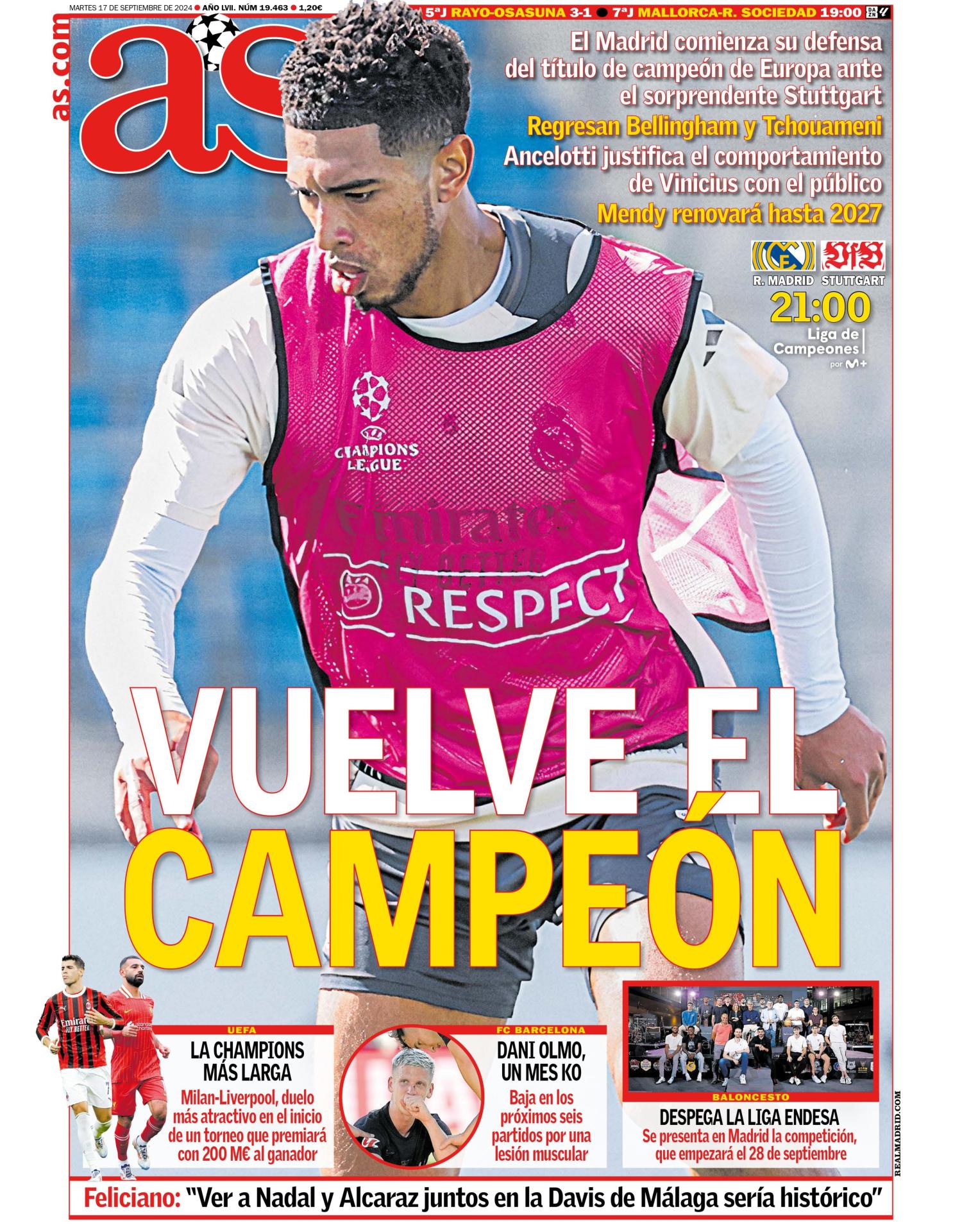 Este martes 17 de septiembre de 2024, el diario as destaca en su portada el primer partido del Real Madrid ante el Stuttgart en esta nueva edición de la Champions League. Un encuentro en el que el conjunto blanco empezará la defensa del título y para el que Ancelotti ya puede contar con Bellingham, recuperado de su lesión.