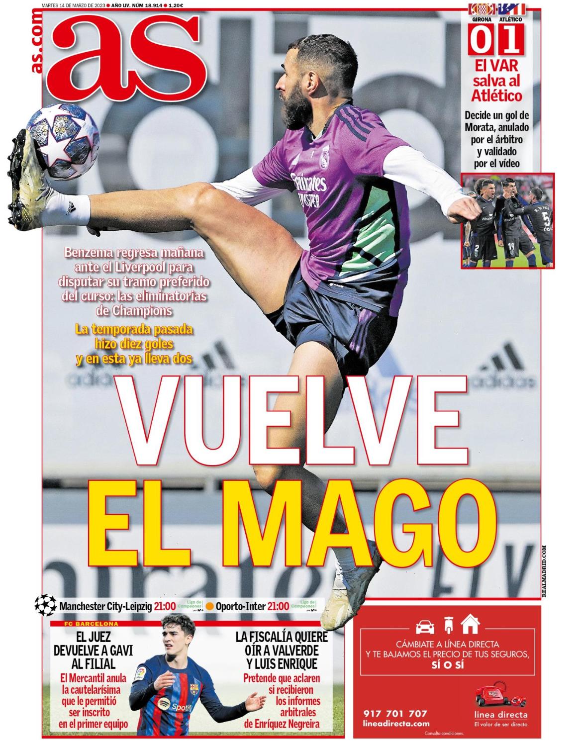 AS abre con el regreso de Karim Benzema a los entrenamientos del Real Madrid. El francés fue baja ante el RCD Espanyol, pero volverá a los terrenos de juego contra el Liverpool.
